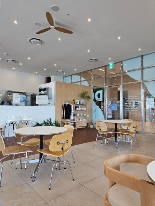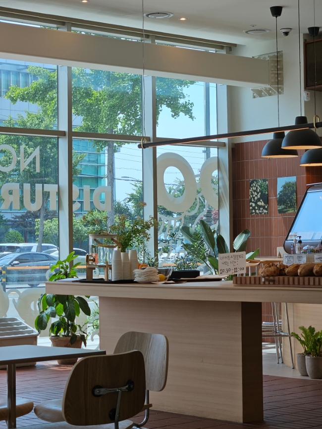 - 커다란 창 너머로 바다를 보며 여유롭게 빵과 커피를 즐길 수 있는 공간! 🌊