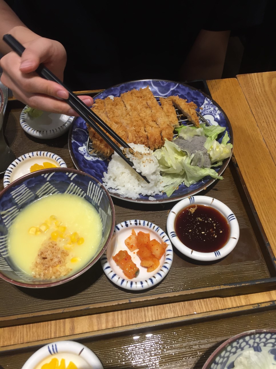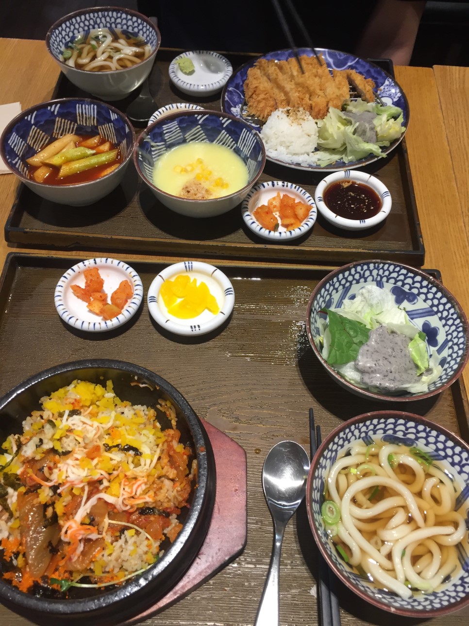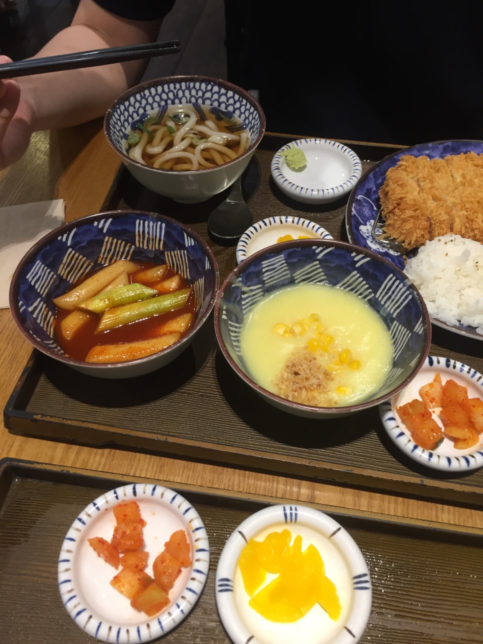 돈까스랑 떡볶이 우동, 스프 등등 한상가득 -
